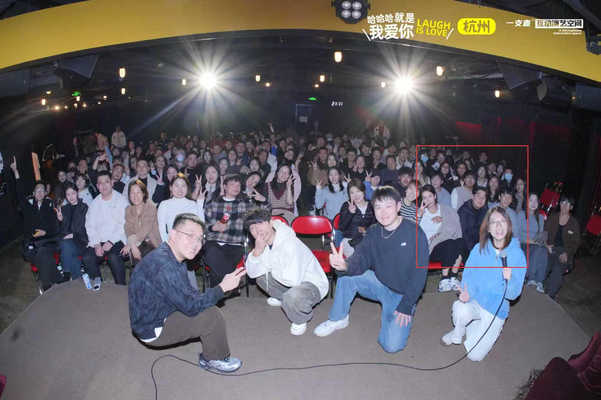 暖黄的灯光下,红色幕布与互动舞台营造出松弛的氛围。大家围坐在一起,跟着演员的段子频频捧腹大笑,有人笑着比出剪刀手,有人跟着互动起哄,平日里伏案科研的专注,此刻都化作肆意的笑声与欢呼。演出结束后,大家还和演员同台合影,把这份鲜活的快乐定格成了难忘的记忆。